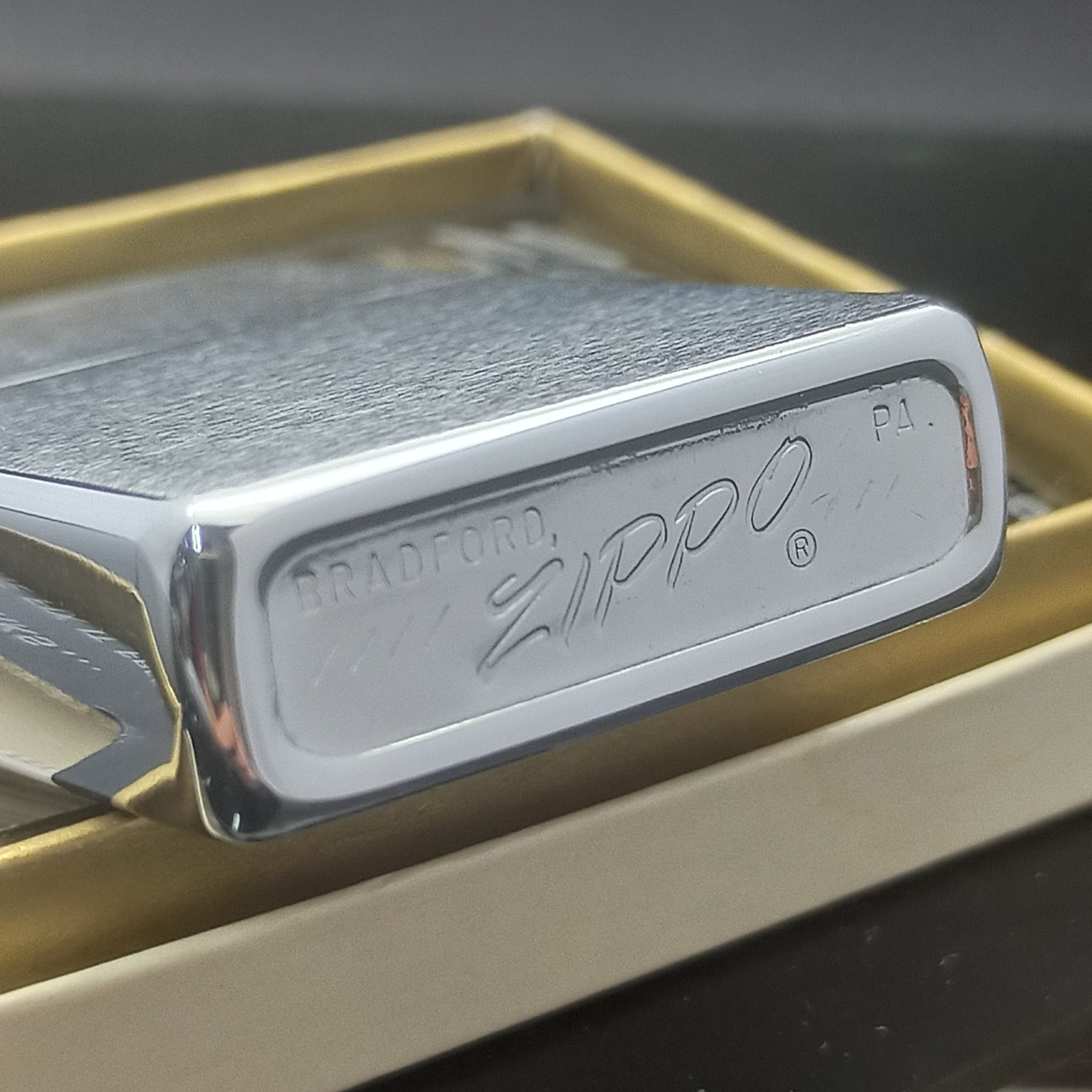 Bật Lửa Zippo Cổ Đồng Khối Mạ Chrome Phay Xước Chủ Đề Ăn Mòn Phủ Sơn Hiếm Gặp Năm 1975 Đời 7 Vạch Sắc ZC369