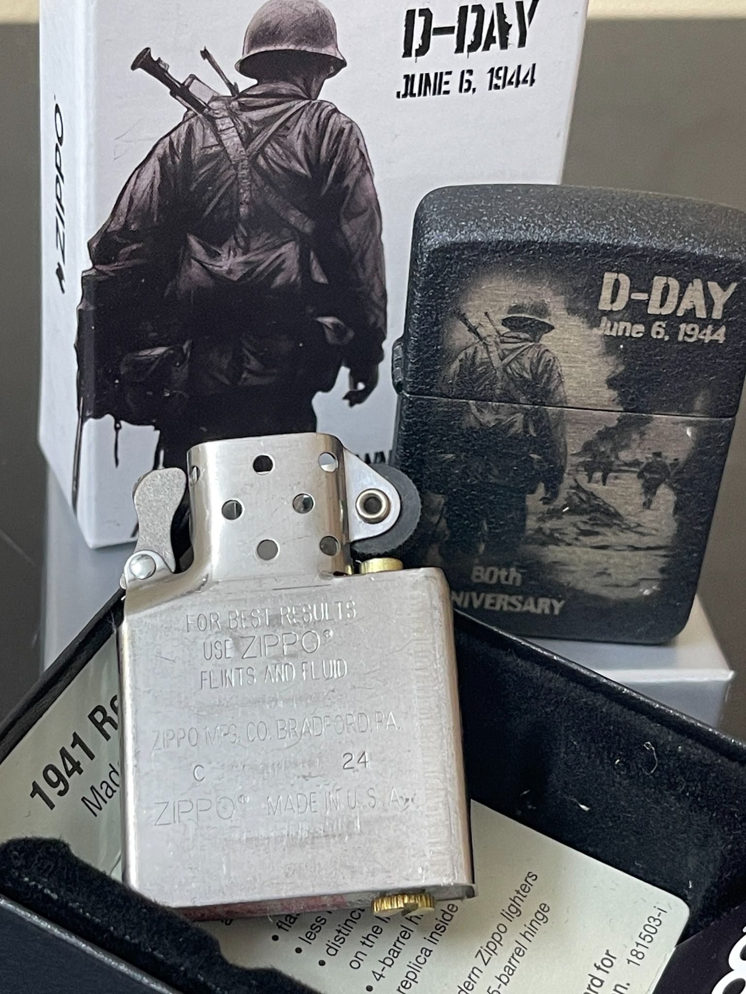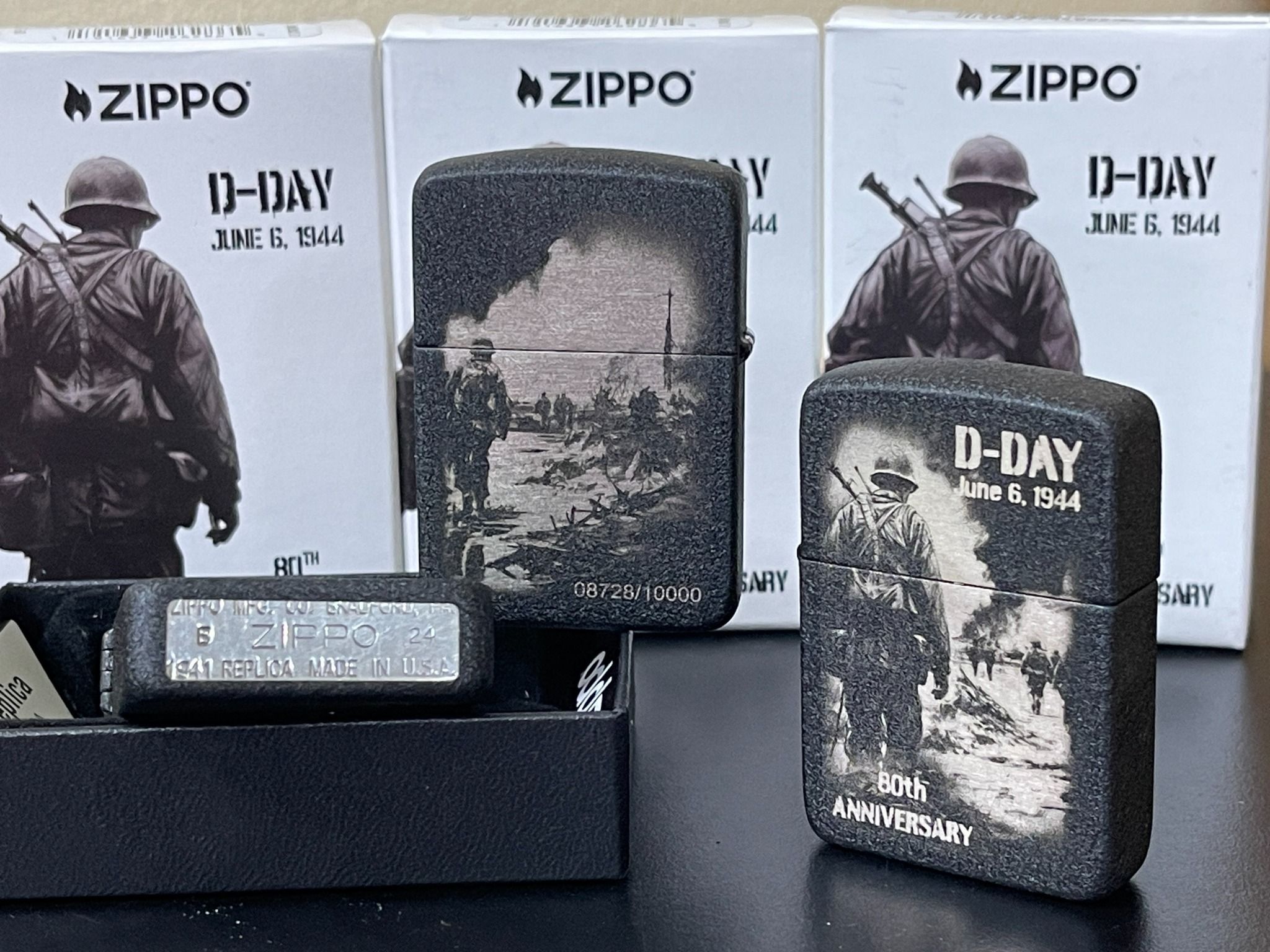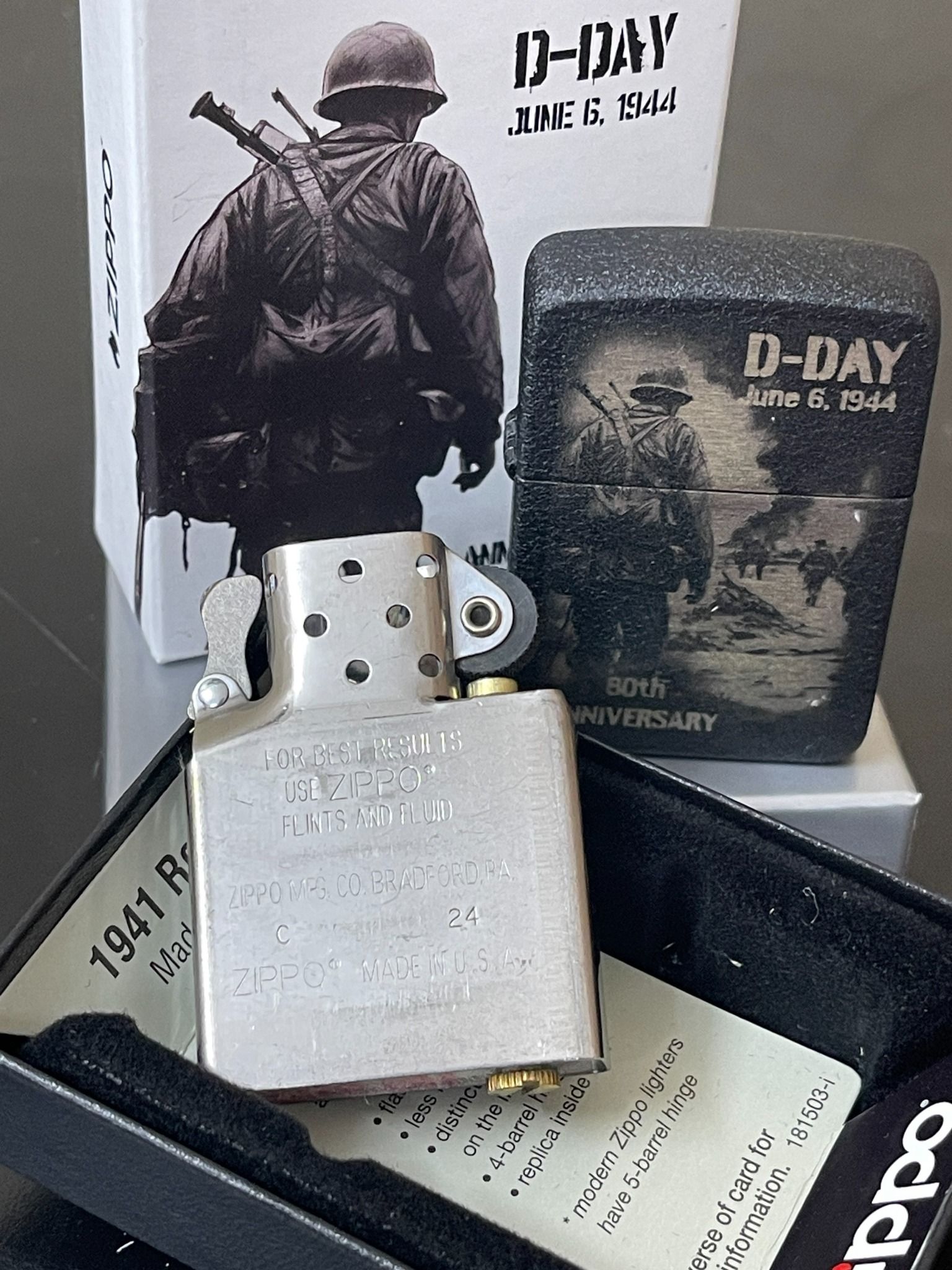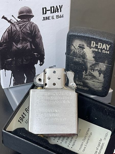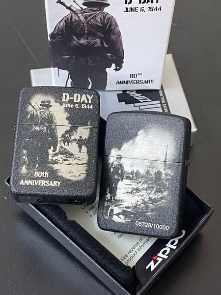 - Ngày 6 tháng 6 năm 1944 hay “D-Day” đánh dấu một bước ngoặt trong thế chiến thứ hai khi lực lượng đồng minh xâm chiếm các bãi biển Normandy để giải phóng nước Pháp khỏi sự kiểm soát của Đức Quốc xã. Lấy bối cảnh trên mô hình bản sao năm 1941, Bộ sưu tập Kỷ niệm 80 năm D-Day của Zippo tưởng nhớ các đội quân đồng minh anh hùng trong thiết kế hình ảnh hai mặt chuyển động. Trong khi đó, lớp hoàn thiện Black Crackle® nhằm tôn vinh những chiếc bật lửa Zippo được lính Mỹ sử dụng, những người thường khắc ngày tháng, cột mốc hoặc thông điệp cá nhân vào lớp phủ bảo vệ.