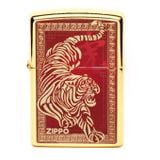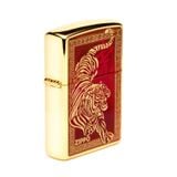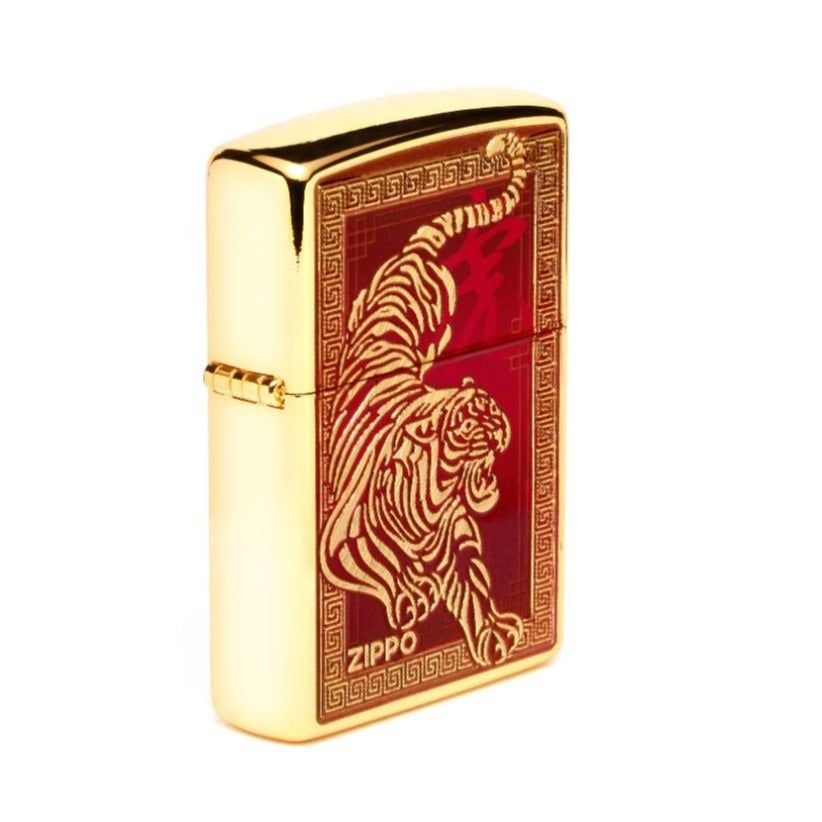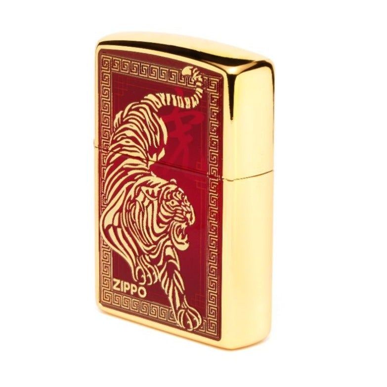 Họa tiết con Giáp Dần được thực hiện trên chiếc Zippo Armor mạ vàng, vỏ dày hơn 1.5 lần so với bản tiêu chuẩn, mặt trước khắc hình con hổ và tráng men đỏ.