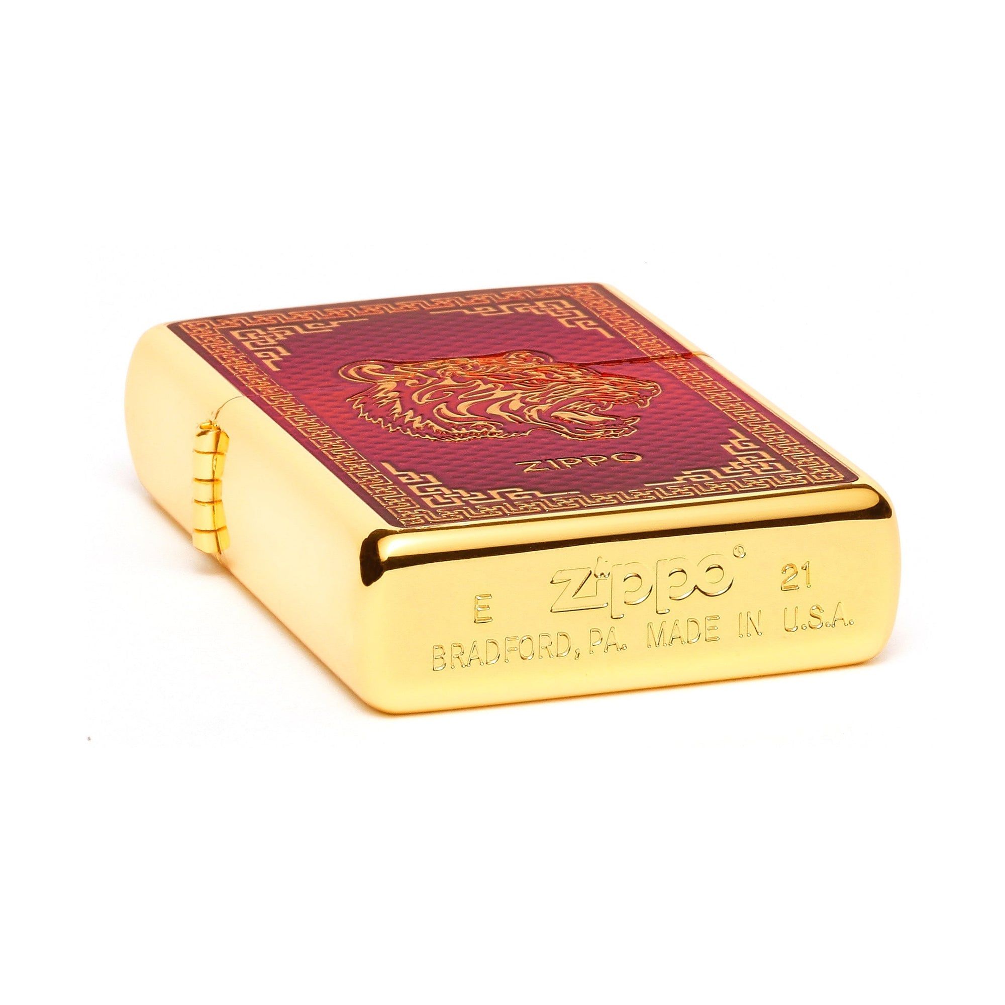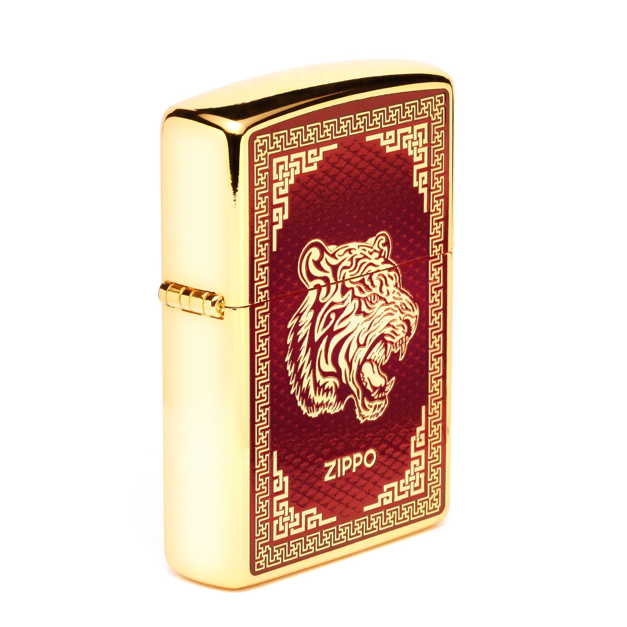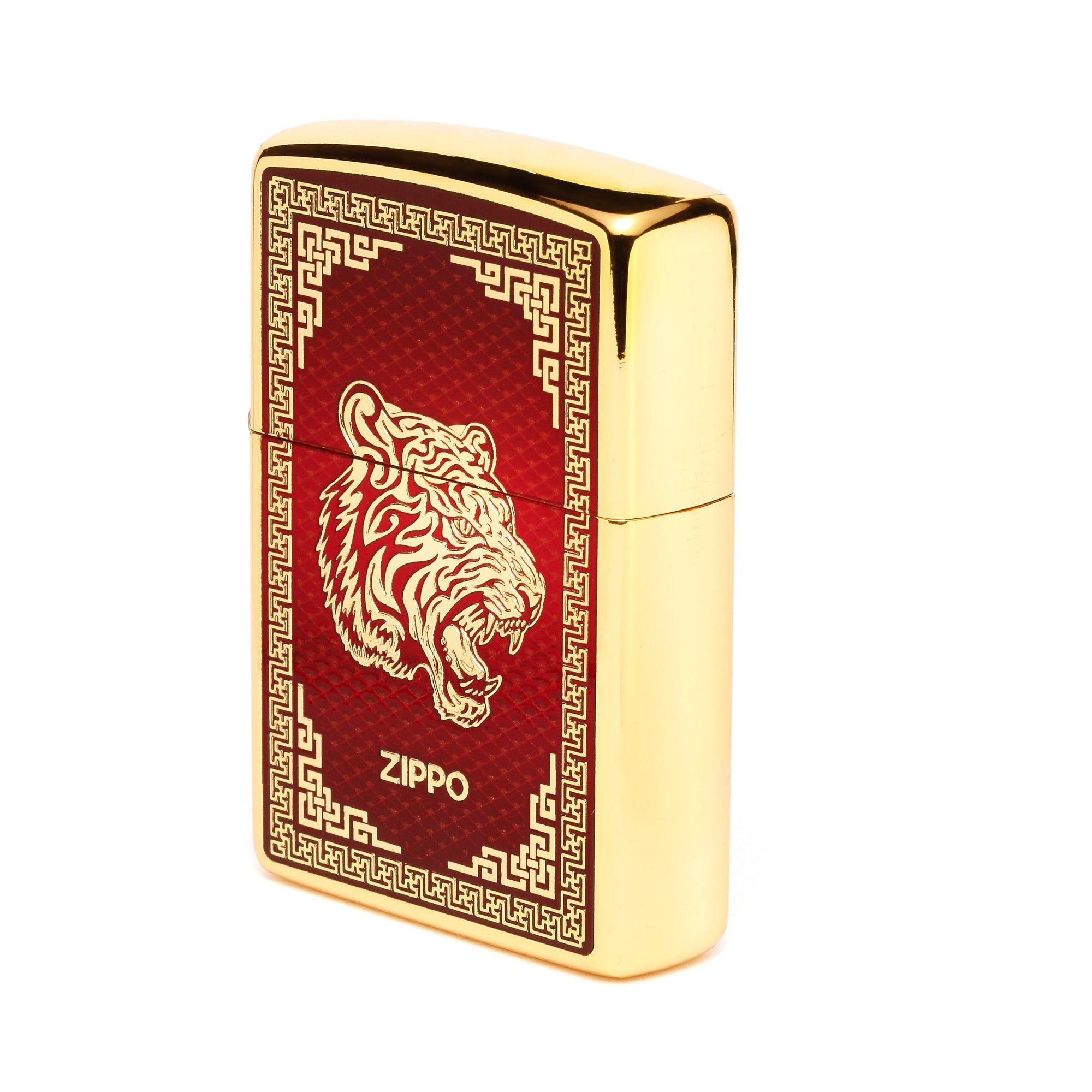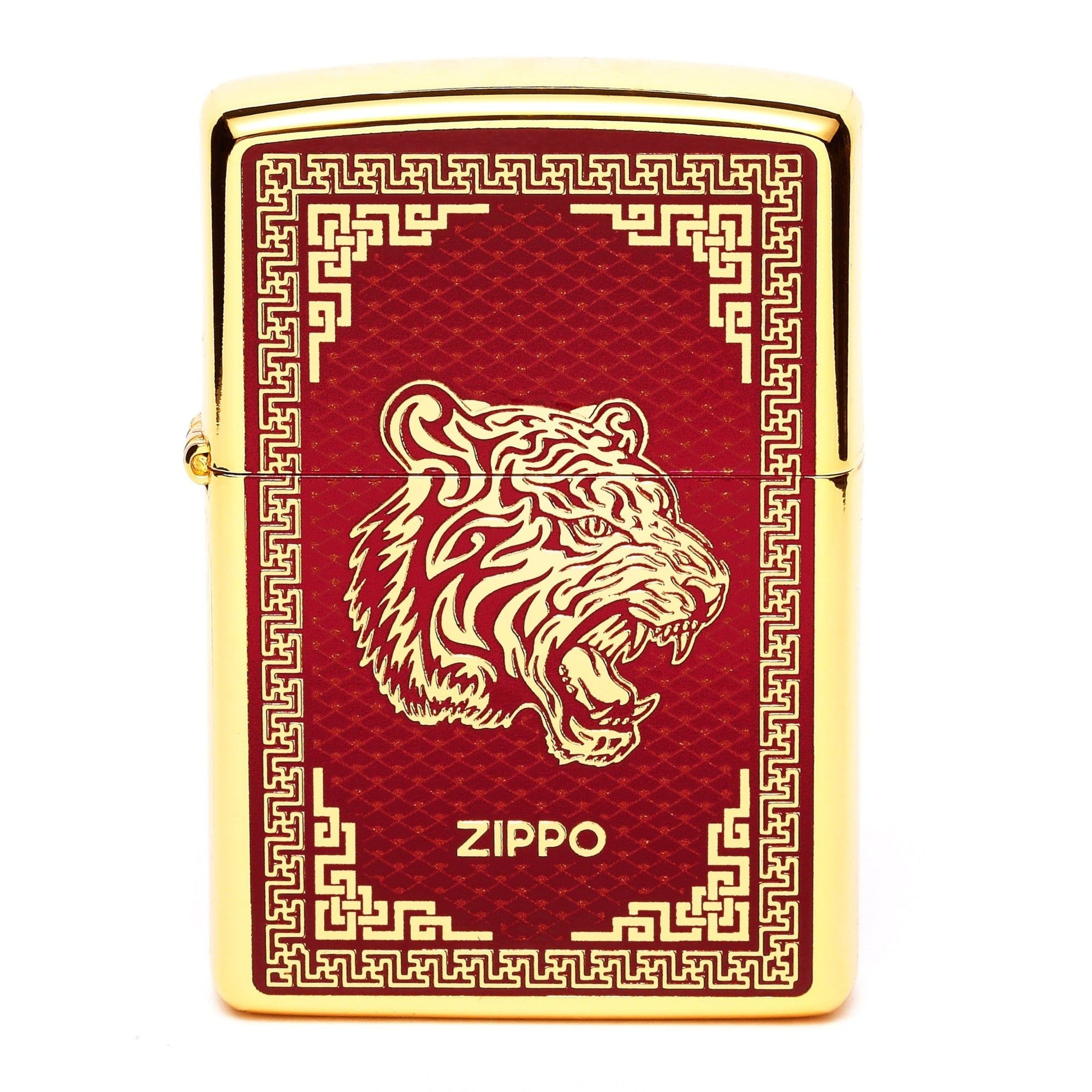 Họa tiết con Giáp Dần được thực hiện trên chiếc Zippo mạ vàng, mặt trước khắc mặt hổ và tráng men đỏ.