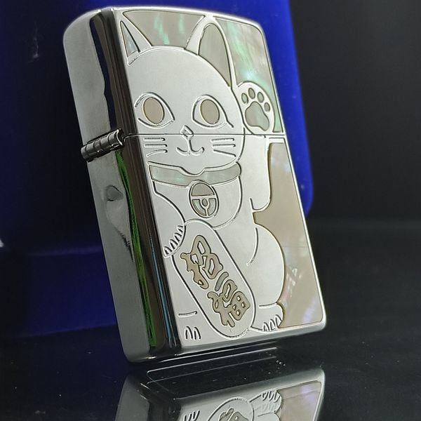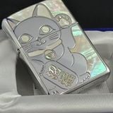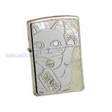 BẬT LỬA ZIPPO USA XUẤT NHẬT KHẢM XÀ CỪ MÈO CHIÊU TÀI MAY MẮN MẠ BẠC BÓNG NỀN TRẮNG - ZN94