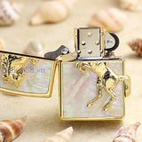 BẬT LỬA ZIPPO USA XUẤT NHẬT MẠ VÀNG NGỰA NỔI NỀN KHẢM XÀ CỪ TRẮNG VÂN HỒNG TRẮNG SANG TRỌNG - ZN95