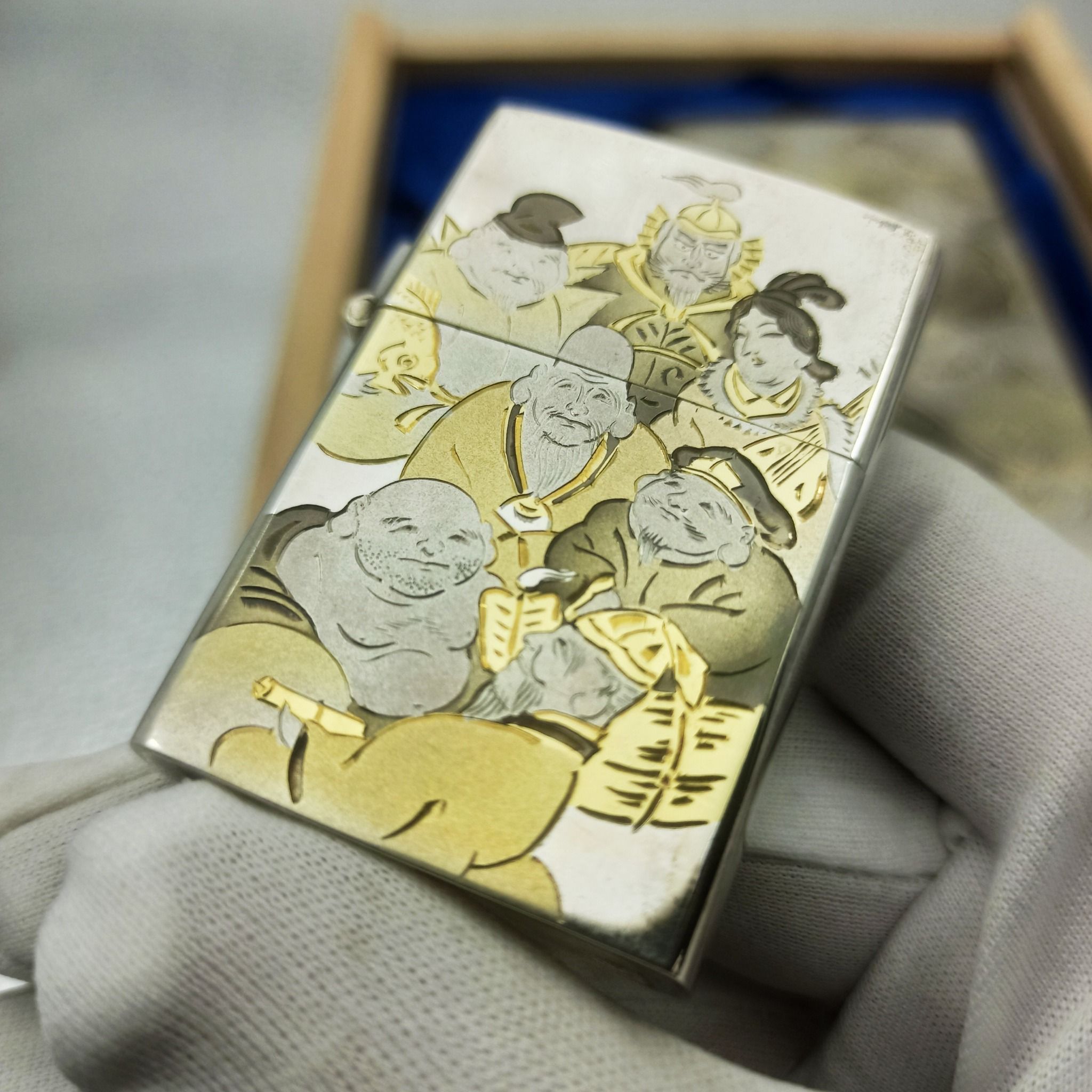 Bộ Bật Lửa Bạc Nguyên Khối Thủ Công Thập Niên 1950 Khảm Tam Khí Thất Phúc Thần May Mắn Cực Hiếm ZB84
