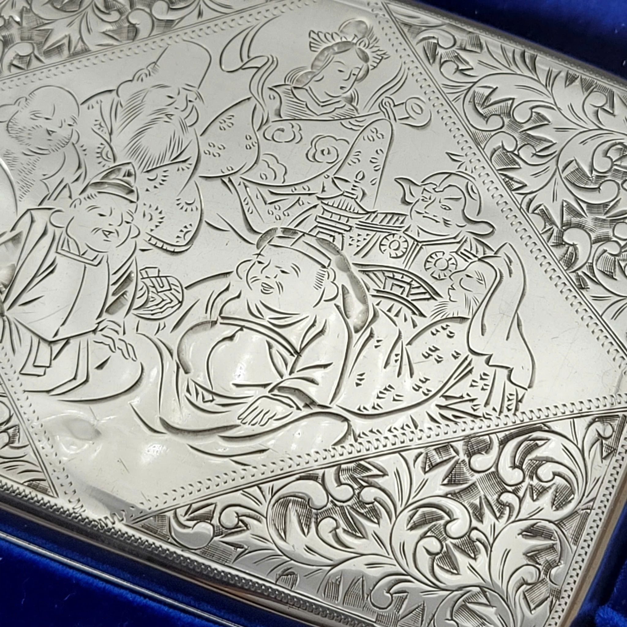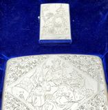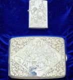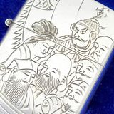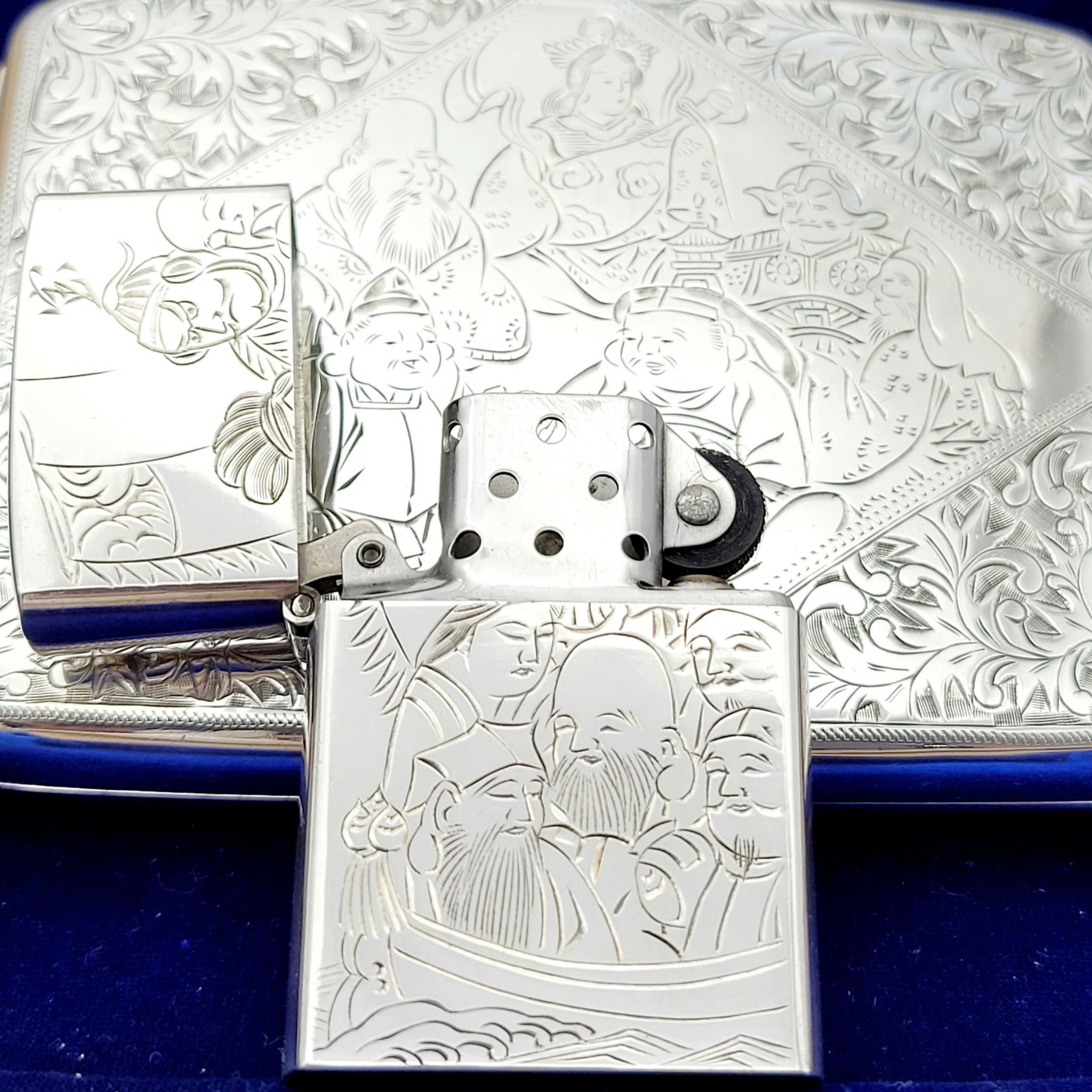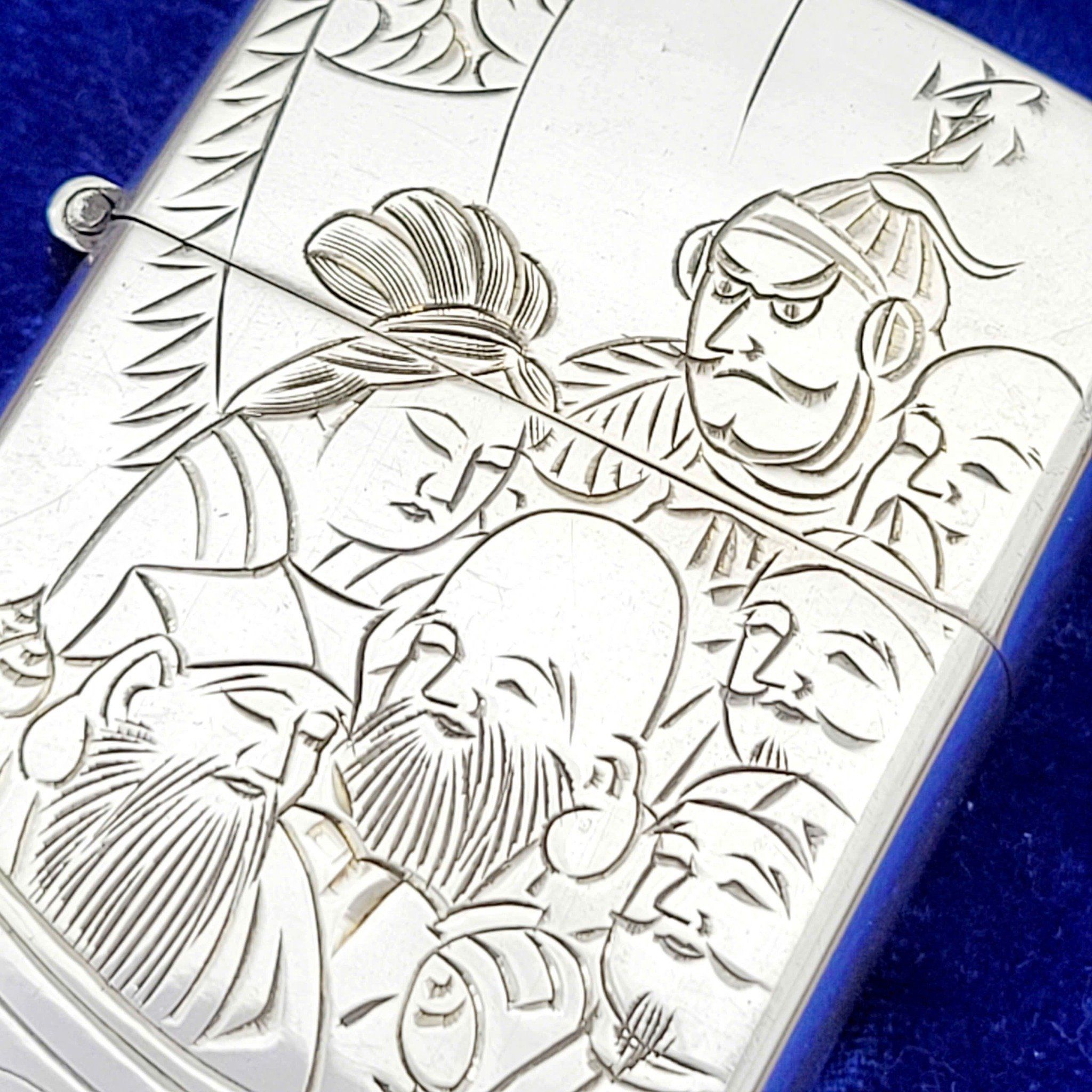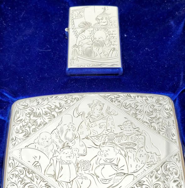 Hàng Sưu Tầm Xưa Vỏ Bạc Nguyên Khối Sản Xuất Thập Niên 1950s Sử Dụng Ruột Zippo Chưa Qua Sử Dụng, Do Nghệ Nhân Người Nhật Làm Toàn Bộ Bằng Tay Thủ Công, Rất Hiếm Gặp, Có Giá Trị Sưu Tầm Cao. Một Trong Những Bộ Bật Lửa Kèm Hộp Thuốc Bằng Bạc 950 Hiếm Hoi Còn Sót Lại Trong Giới Sưu Tầm Có Giá Trị Lịch Sử Và Văn Hoá Rất Lớn - Toàn Thân Chạm Khắc Hoa Văn Tỉ Mỉ Tinh Tế THẤT PHÚC THẦN ( 7 Vị Thần May Mắn )
