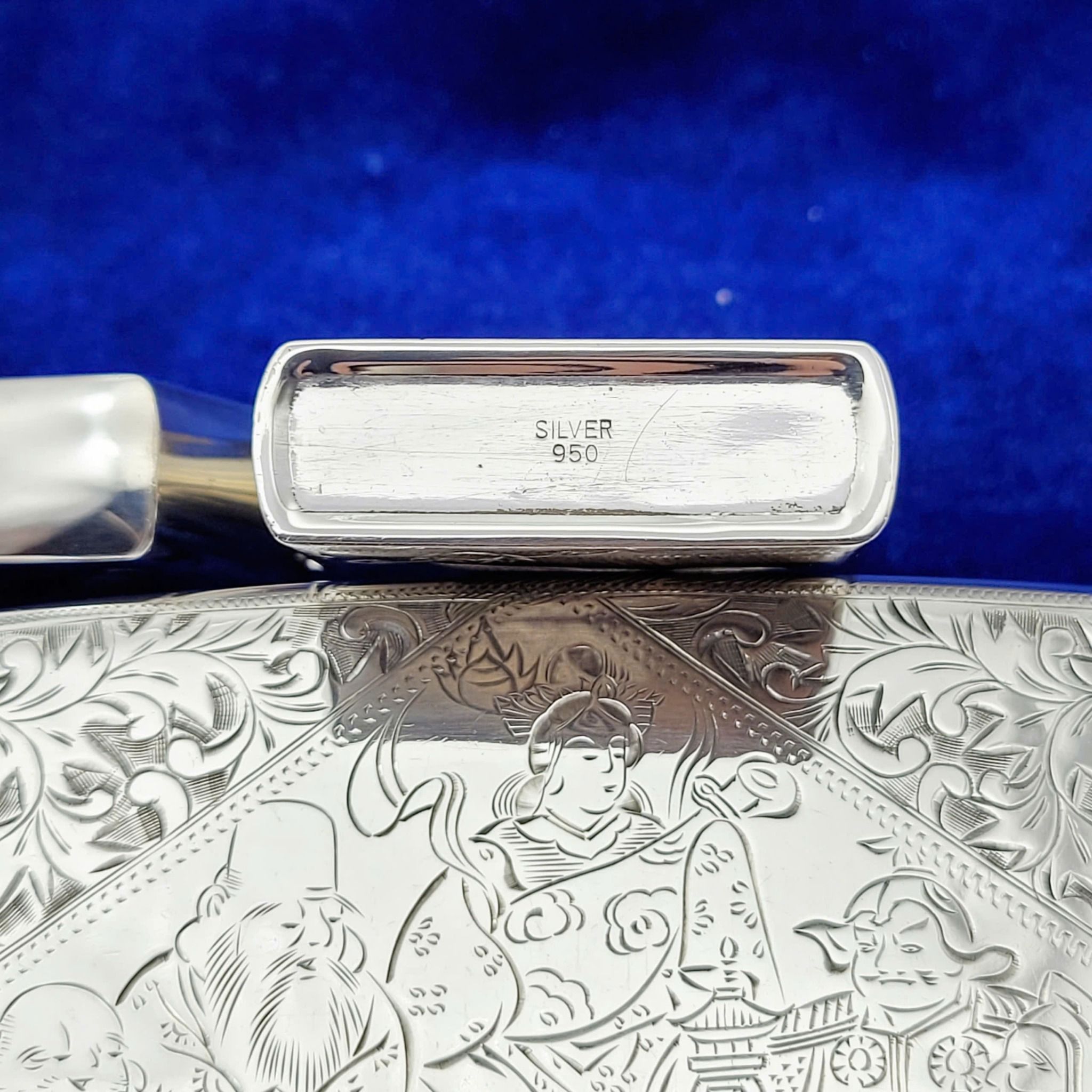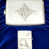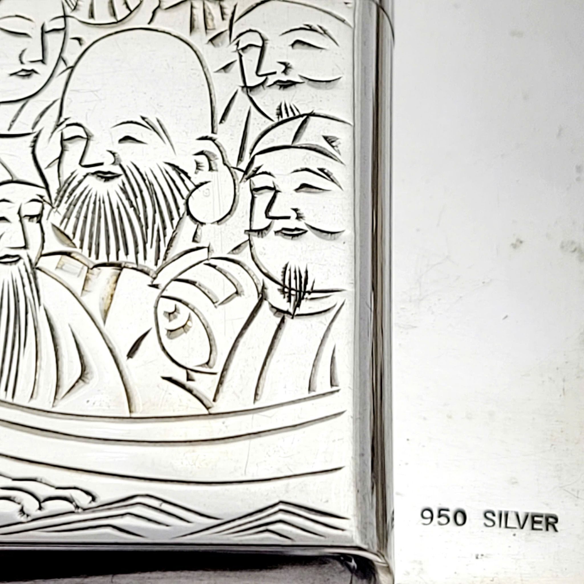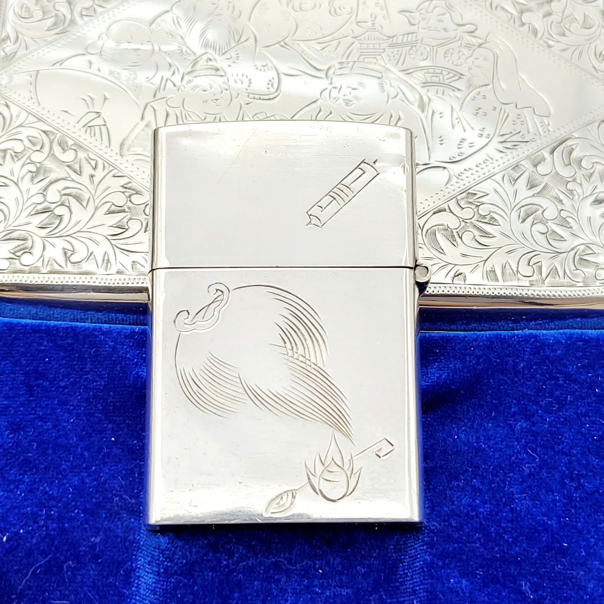 Hàng Sưu Tầm Xưa Vỏ Bạc Nguyên Khối Sản Xuất Thập Niên 1950s Sử Dụng Ruột Zippo Chưa Qua Sử Dụng, Do Nghệ Nhân Người Nhật Làm Toàn Bộ Bằng Tay Thủ Công, Rất Hiếm Gặp, Có Giá Trị Sưu Tầm Cao. Một Trong Những Bộ Bật Lửa Kèm Hộp Thuốc Bằng Bạc 950 Hiếm Hoi Còn Sót Lại Trong Giới Sưu Tầm Có Giá Trị Lịch Sử Và Văn Hoá Rất Lớn - Toàn Thân Chạm Khắc Hoa Văn Tỉ Mỉ Tinh Tế THẤT PHÚC THẦN ( 7 Vị Thần May Mắn )