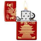 Chất liệu vỏ: Đồng thau nguyên khối, khắc laser hình Rồng bay trên một ngôi đền cổ trên bật lửa đồng thau, nền mạ màu đỏ ánh kim.
