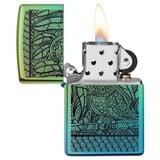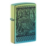 Chất liệu vỏ: Đồng thau nguyên khối, thiết kế có hình ảnh một chú chim với màu sắc mới giới thiệu tác phẩm sống động của John Smith Gumbala trên canvas của chiếc bật lửa Teal High Polish.