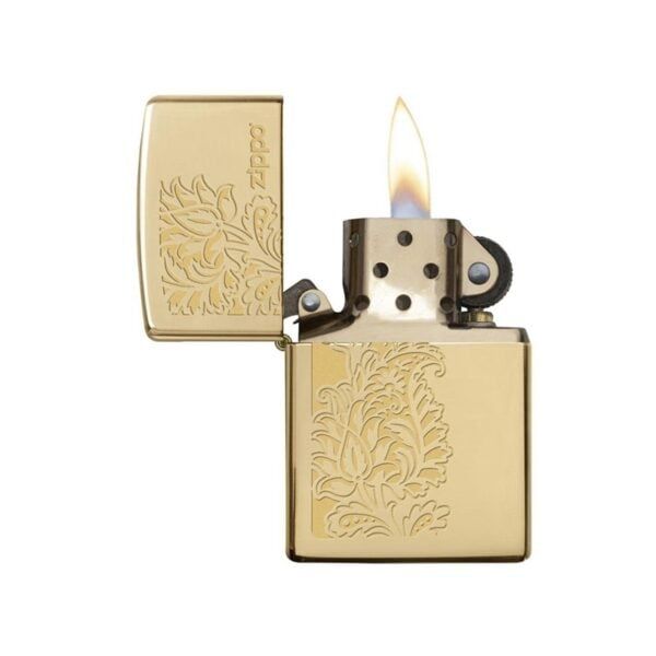 Chất liệu vỏ: Đồng thau nguyên khối, thiết kế hình hoa được chạm khắc tinh xảo trên nền Zippo đồng thau cao cấp
